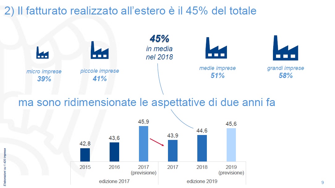 - Il fatturato realizzato all’estero incide per il 45% del totale con tendenza crescente all’aumentare della dimensione (38% micro, 41% piccole, 51% medie, 58% grandi);
