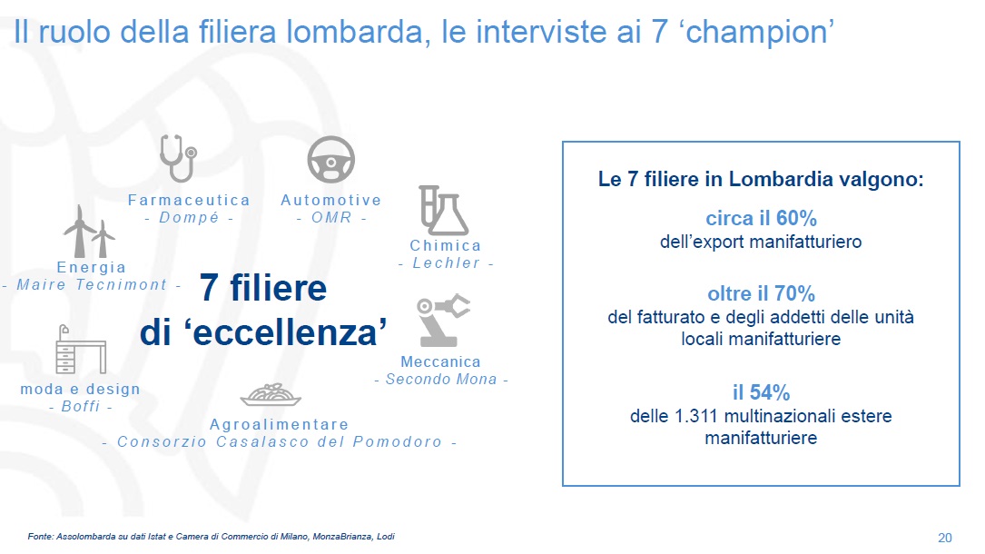 L’Indagine ha raccolto informazioni presso oltre 1700 imprese lombarde associate al Sistema Confindustria Lombardia e include un focus sulle catene globali del valore, approfondito anche attraverso interviste a 7 imprese champion altamente internazionalizzate e rappresentanti dei settori agroalimentare (Consorzio Casalasco del Pomodoro), automotive (OMR), chimico (Lechler), energia (Maire Tecnimont), farmaceutico (Dompé, meccanica (Secondo Mona) e moda e design (Boffi).
