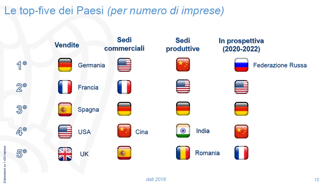 - L’UE rimane ancora l’area principale di destinazione delle vendite, la Cina è il primo Paese per scelta delle sedi produttive;