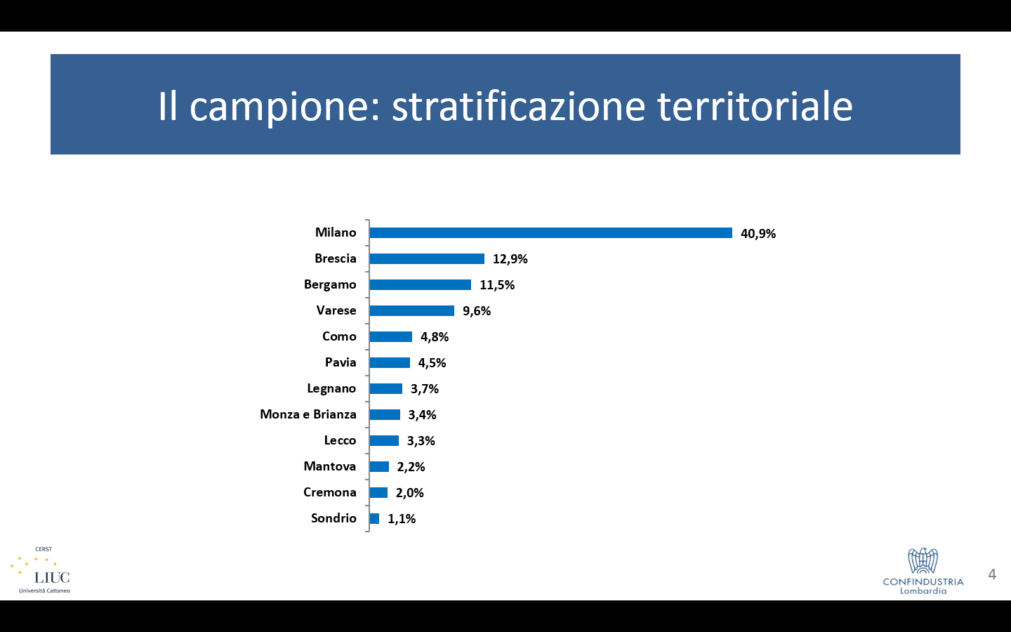 Il campione analizzato dal Centro studi di Confindustria Lombardia è composto da 1.430 imprese associate per 213.467 addetti. Il 72,4% delle imprese campione appartiene all’industria manifatturiera, il 27,6% al terziario. Il campione copre in maniera omogenea tutte le classi dimensionali, e tutte le classi di intensità tecnologica (Low Tech 22,4%, Medium Low 35,9%, Medium High 32,1%, High Tech 9,6%.