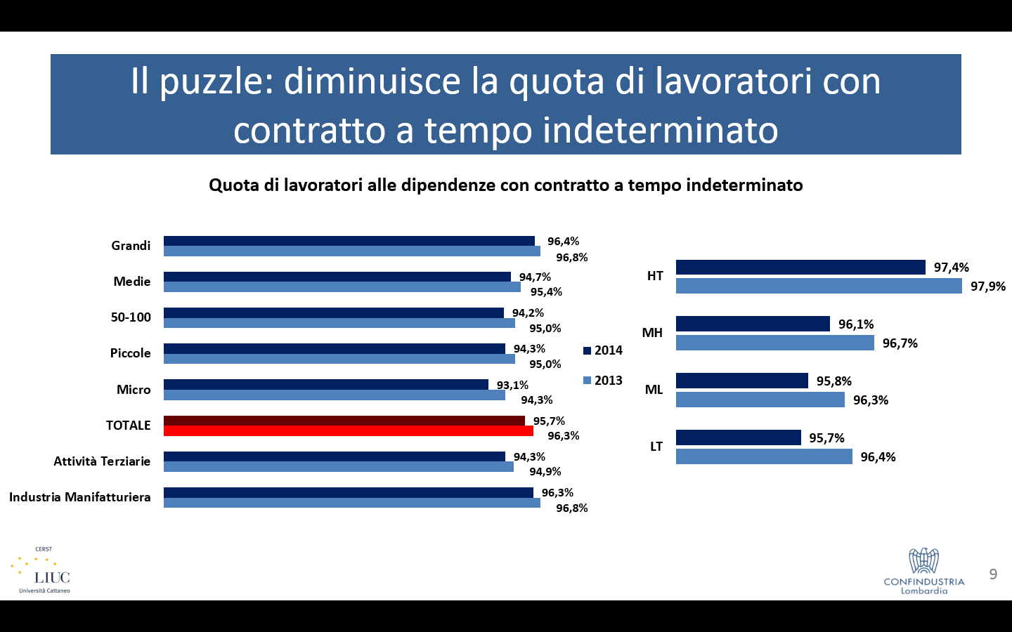 Milano, 21 luglio 2015 – Per il mercato del Lavoro lombardo il 2014 è stato un anno sospeso, di attesa. Non sono mancati i segnali positivi, in particolare tra le aziende medium e high tech, oltre alle conferme di alcune peculiarità tutte lombarde. In particolare si conferma l’alto tasso di femminilizzazione, una lieve contrazione dei contratti a tempo indeterminato, e la grande attenzione delle imprese ai programmi di welfare aziendale. Segnali quindi contrastanti quelli emersi dall’Indagine ‘Il Lavoro in Lombardia – Rapporto 2015’ effettuata dal Centro studi di Confindustria Lombardia, in collaborazione con l’Università Cattaneo – LIUC, su un campione di 1.430 imprese rappresentativo di tutte le province lombarde.
