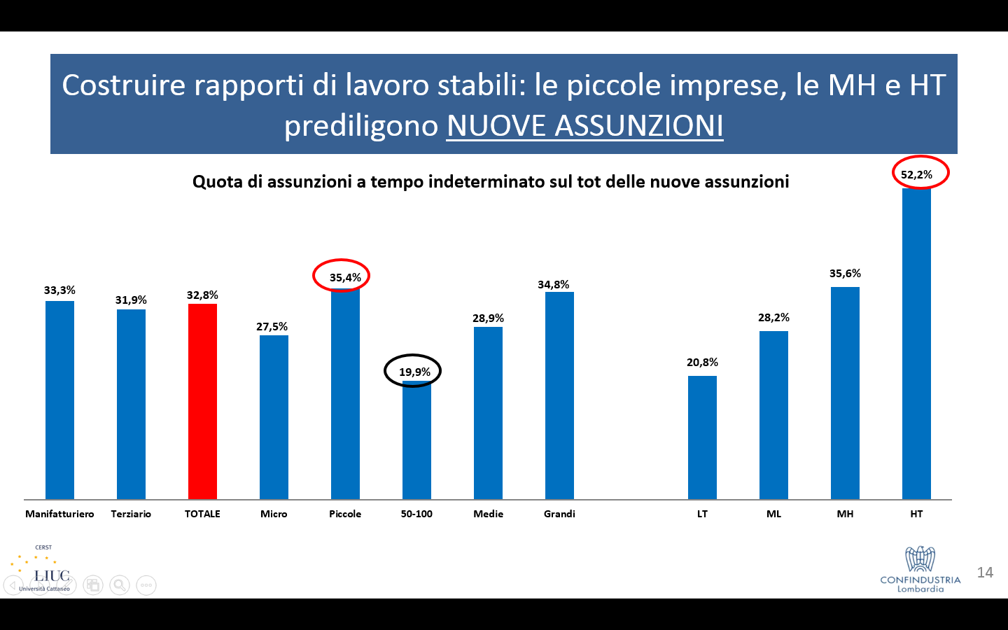 - Le imprese operanti nei settori a medio-alta e alta tecnologia sono le più aperte a donne e giovani, con una forte attenzione a politiche di retention delle risorse umane. Secondo l’indagine 2015 di Confindustria Lombardia sul Mercato del lavoro lombardo per il 2014 è in queste aziende che si riscontrano i più alti tassi di femminilizzazione dei dipendenti in Lombardia (rispettivamente 21.8% per le medium-high tech e il 30.8% per le high tech) e un ricorso superiore alla media regionale ai contratti di apprendistato (li usa il 26.2% delle aziende MHT e il 21.2% delle HT). Le imprese dei settori a maggiore intensità tecnologica brillano inoltre per la più alta incidenza di nuove assunzioni a tempo indeterminato (rispettivamente il 35.6% e il 52.2% del totale assunzioni) e maggior ricorso a strumenti di welfare (li utilizza rispettivamente il 46,7% delle MHT e il 52.5% delle HT); (grafico 3)