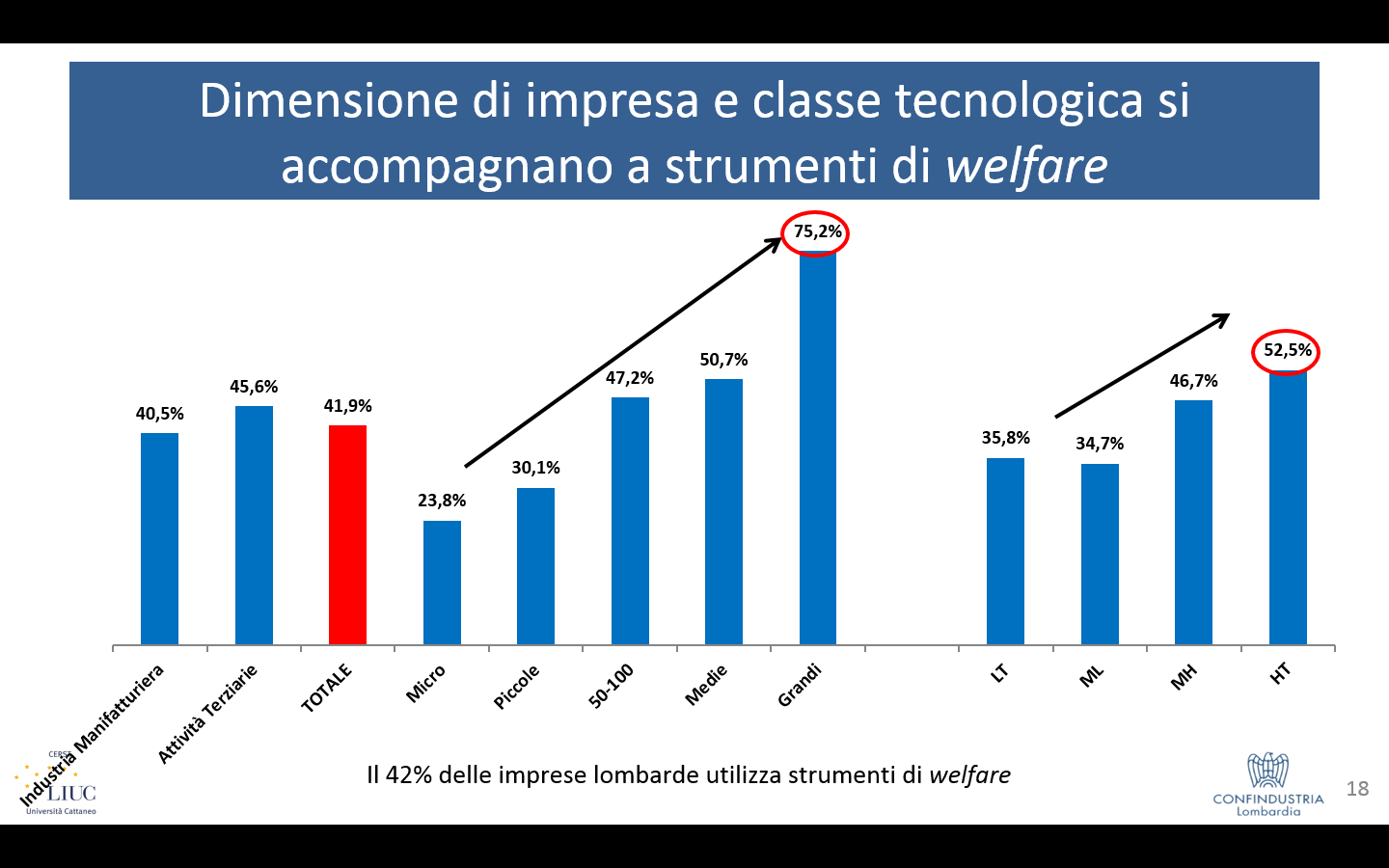 - Nonostante l’austerità imposta dalla lunga crisi, le imprese lombarde non hanno “tagliato” le risorse di welfare aziendale, anzi. In base all’indagine 2015 di Confindustria Lombardia sul Mercato del lavoro lombardo per il 2014, nel 42% delle imprese lombarde i dipendenti beneficiano di programmi di welfare, in molti casi avviati proprio negli ultimi anni; (grafico 4)