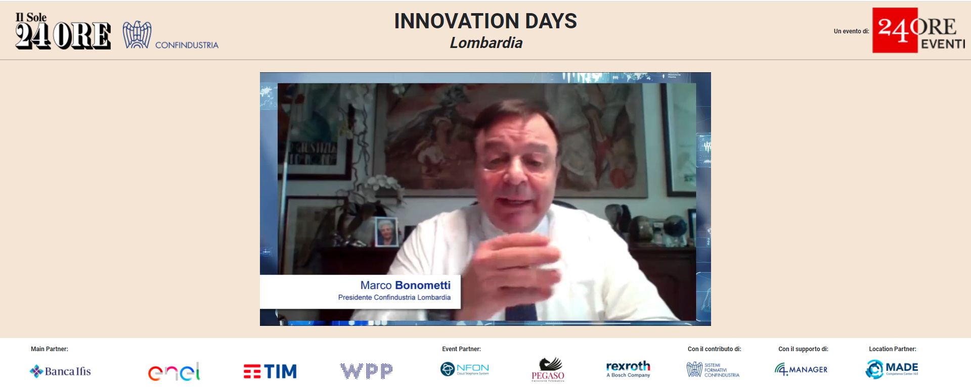 Il Presidente di Confindustria Lombardia Marco Bonometti, intervenendo all’evento digitale del Sole 24 Ore e Confindustria "Innovation Days – La fabbrica del futuro" ha detto: “Per costruire l’Italia di domani l’unica strada è rilanciare l’industria perchè senza industria non può esserci crescita, né tanto meno innovazione e competitività. C’è bisogno di una vera politica industriale che sappia cogliere le opportunità fondamentali del Recovery fund, con l’obiettivo di supportare gli investimenti, sia pubblici che privati, creando sviluppo e occupazione. Due i fattori decisivi nell’immediato: la trasformazione digitale del sistema produttivo e della pubblica amministrazione, con l’obiettivo di accompagnare la transizione delle filiere industriali ed eliminare la burocrazia. Determinanti saranno poi le competenze: le imprese devono poter contare sulla possibilità di reperire sul mercato le professionalità di cui hanno bisogno. Dalle scelte che faremo o non saremo in grado di fare ora dipenderà il futuro economico e sociale del Paese”.