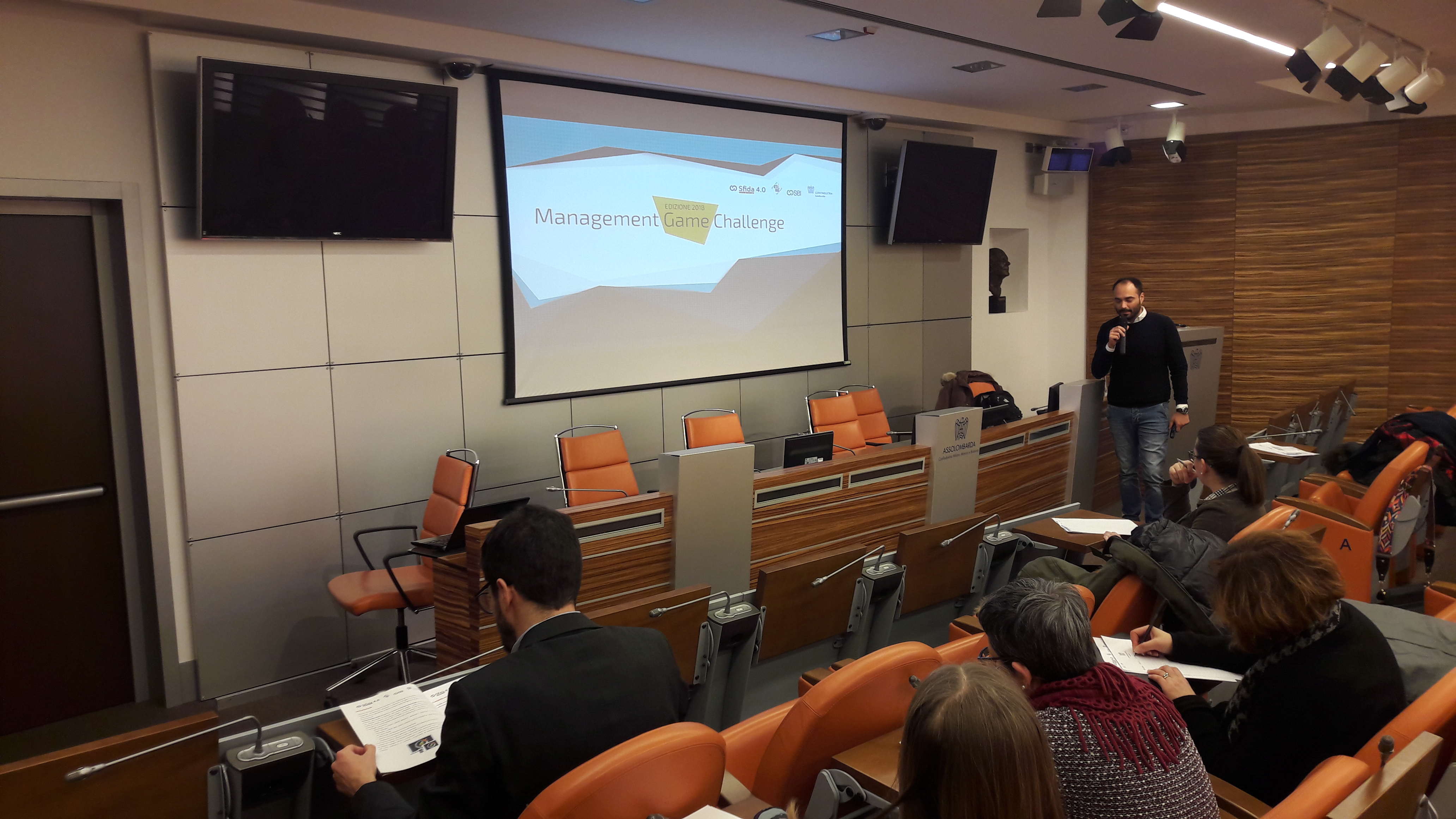 soprattutto di analisi strategica e decision making. Nel Management Game ogni team, costituito da 3-4 membri, rappresenta e gestisce una azienda simulata: il business game è suddiviso in round di simulazione. Ogni round rappresenta 6 mesi di vita aziendale: al termine di ogni round, i team possono analizzare i risultati del mercato e rivedere le proprie strategie per migliorare la loro posizione di mercato. L’obiettivo è di rendere una azienda virtuale leader del mercato, incrementandone il valore.