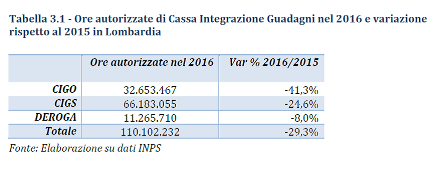 E’ dalla Cassa Integrazione Guadagni che nel 2016 giungono alcune tra le indicazioni più positive: in Lombardia sono state oltre 110 milioni le ore autorizzate, in riduzione (-29,3%) rispetto all’anno precedente (tabella 3.1).