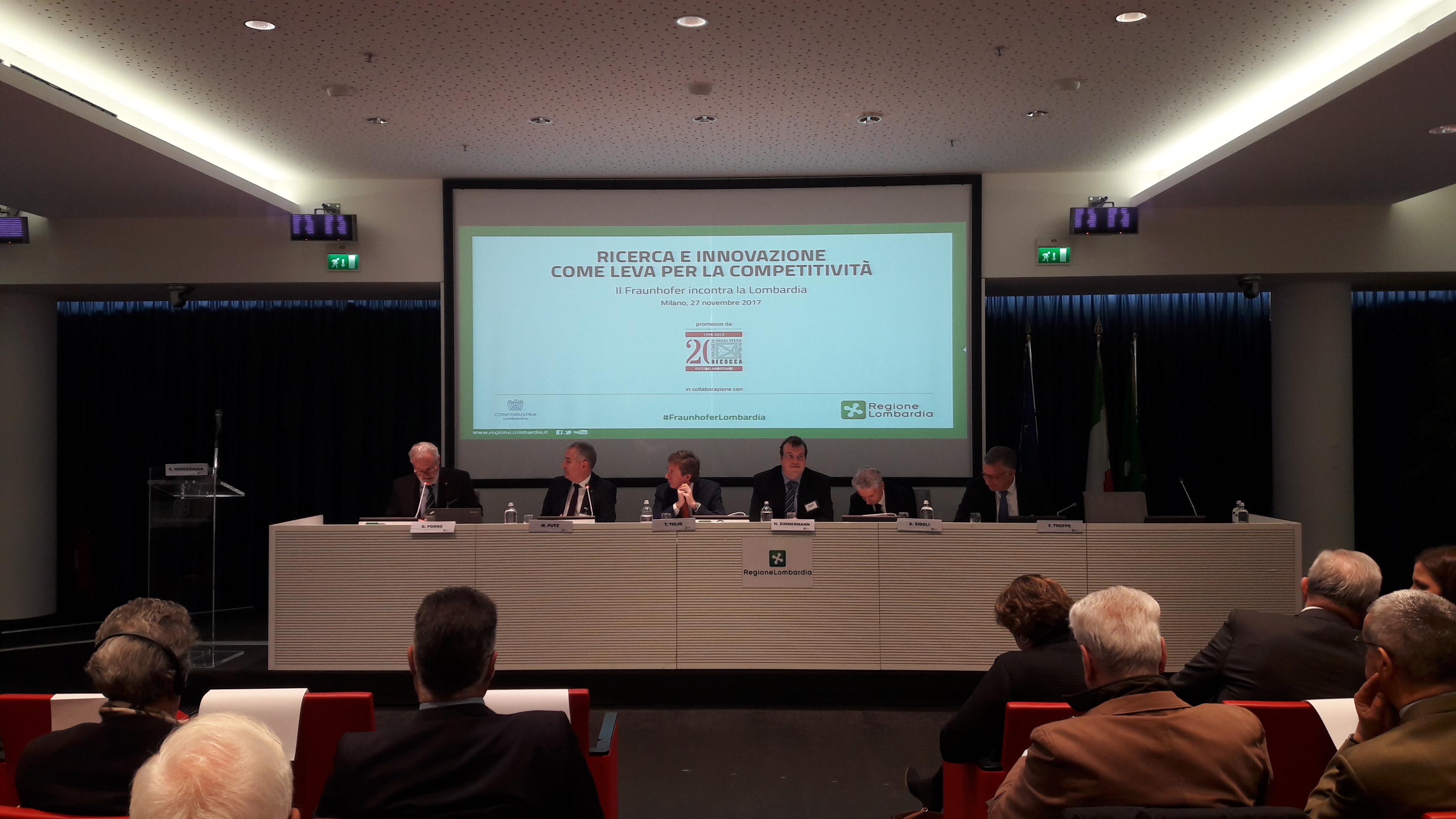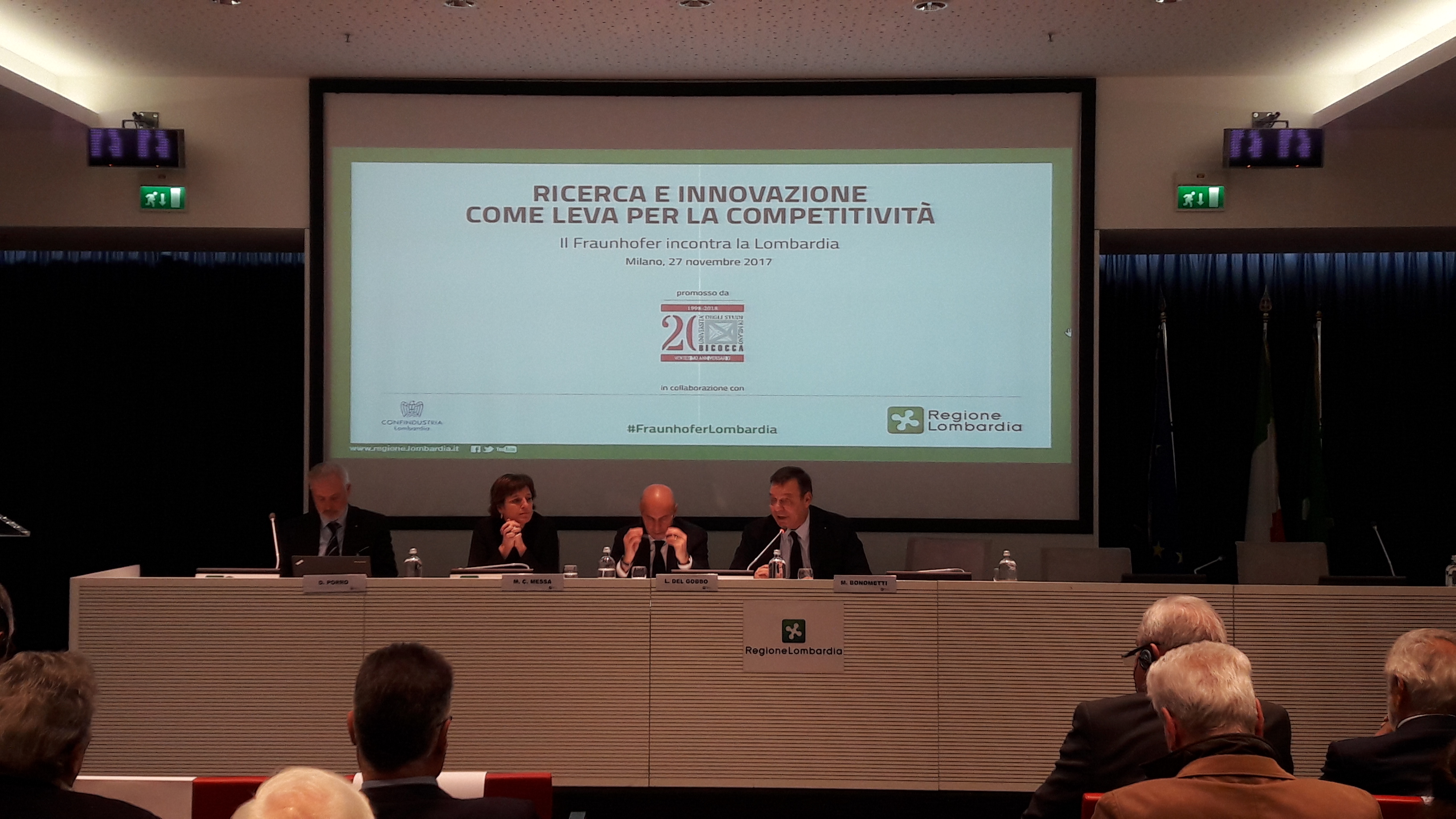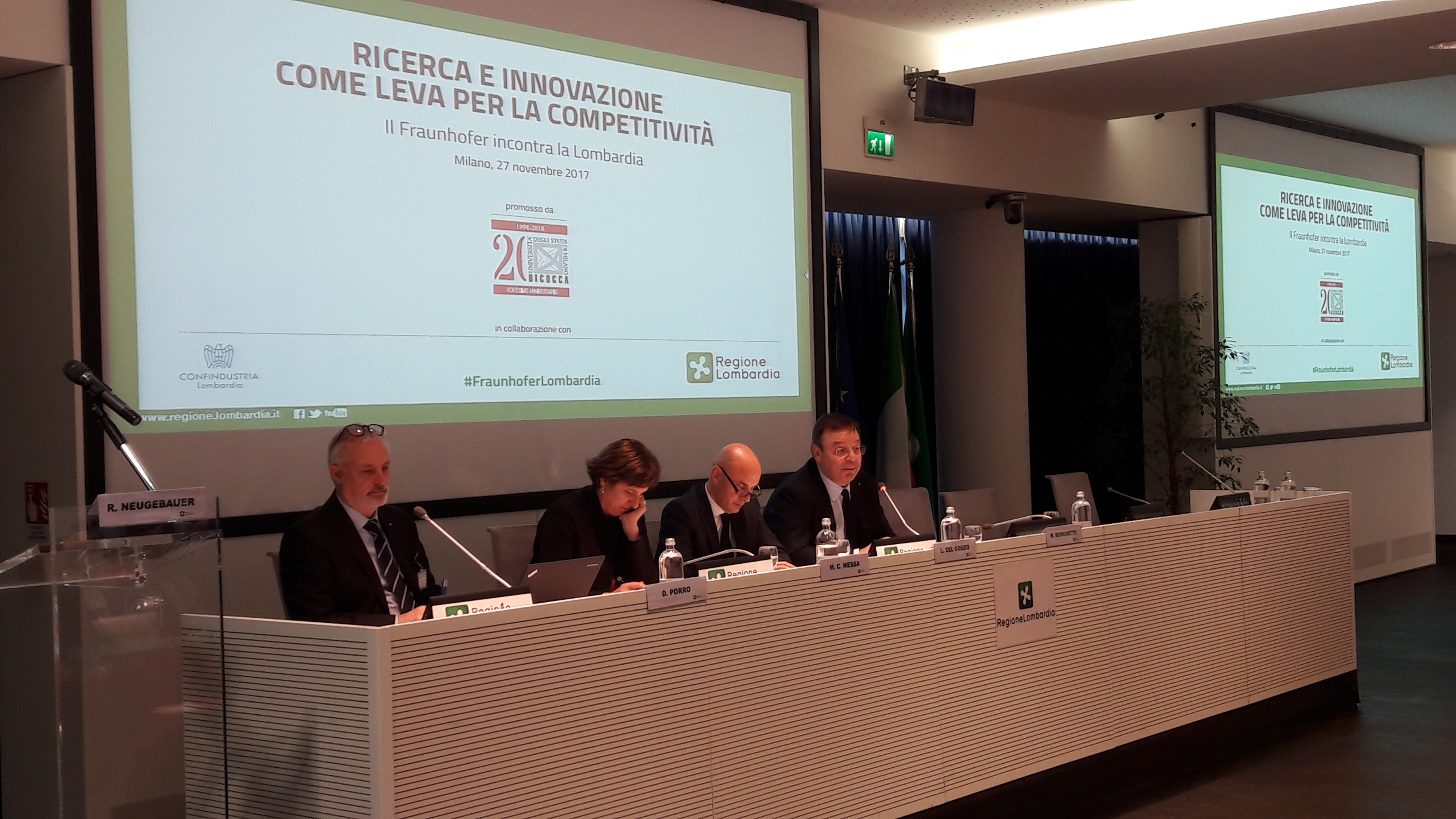 Milano, 27 novembre 2017 – Oltre 150 soggetti rappresentati tra imprese, università, operatori di ricerca, istituzioni e categorie economiche hanno partecipato all’evento “Ricerca e Innovazione come leva per la competitività: il Fraunhofer incontra la Lombardia”, aperto oggi - nella sala Biagi di Palazzo Lombardia – dal saluto dell’assessore regionale all’Università, Ricerca ed Open innovation, Luca Del Gobbo.