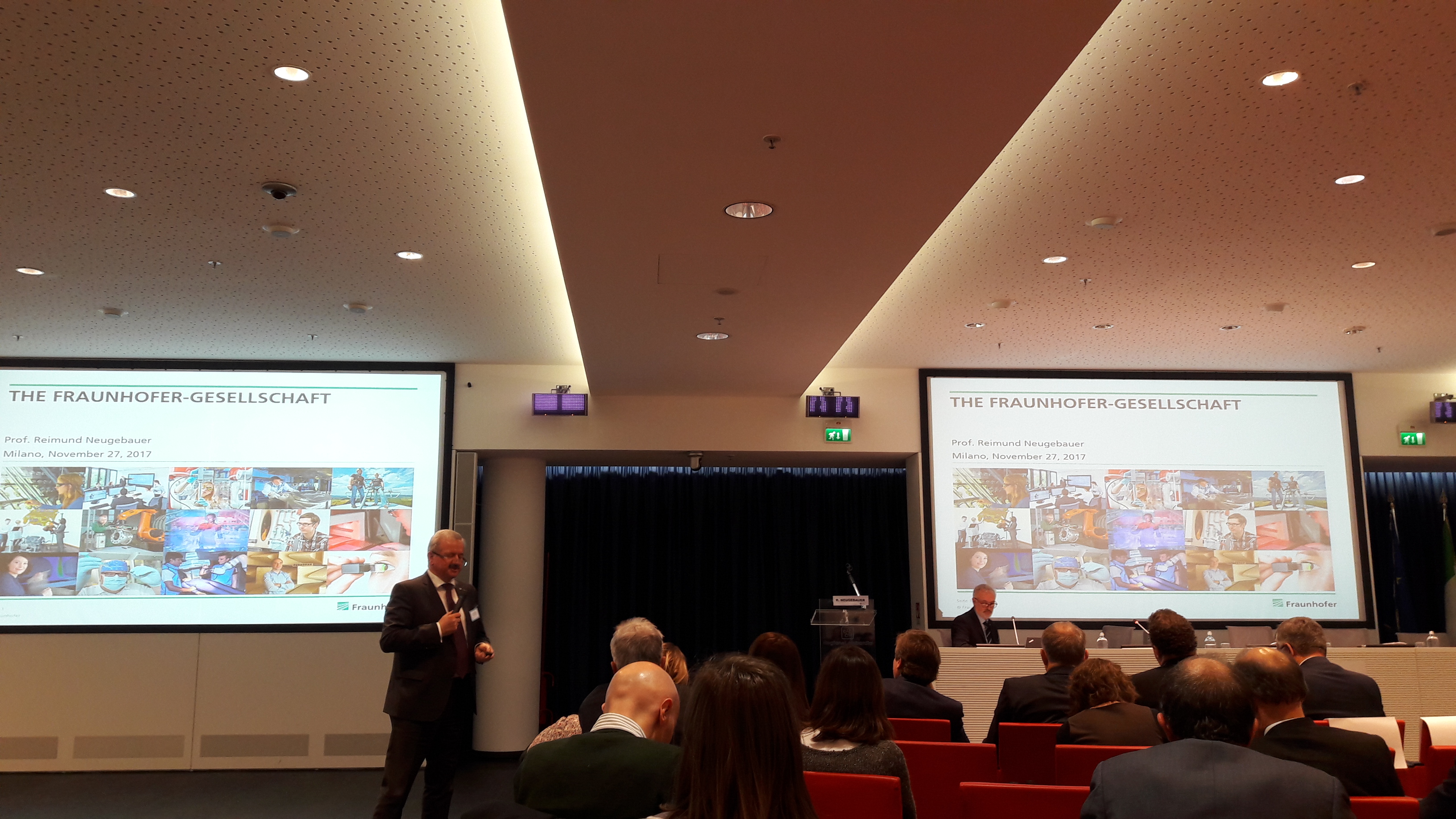 I lavori sono continuati con l'intervento di Reimund Neugebauer, presidente dell'istituto Fraunhofer, che ha illustrato la filosofia e il metodo di lavoro alla base del successo della realtà tedesca, che dal 2009 ha anche un'affiliata italiana: Fraunhofer Italia Research, con sede a Bolzano.