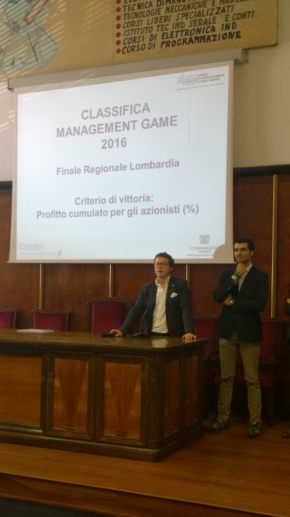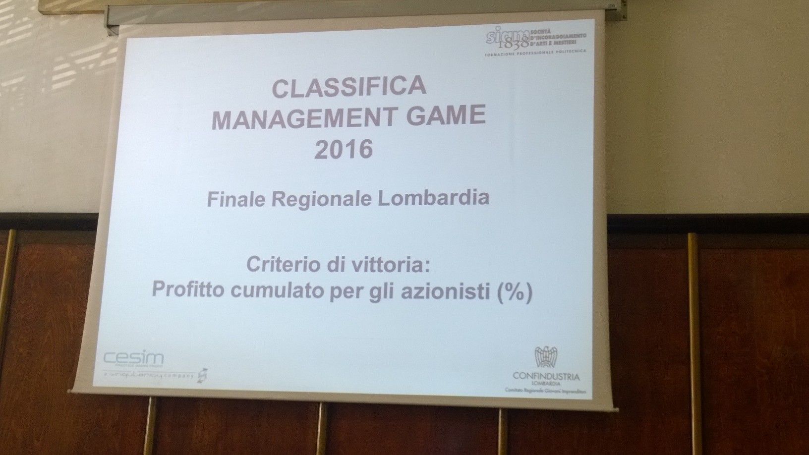 Milano, 7 maggio 2016 – Si è svolta oggi, presso la sede del SIAM 1838 a Milano, la finale del Management Game 2016, il gioco di simulazione aziendale promosso dal Comitato Regionale dei Giovani Imprenditori di Confindustria Lombardia e riservato agli studenti delle classi quarte.