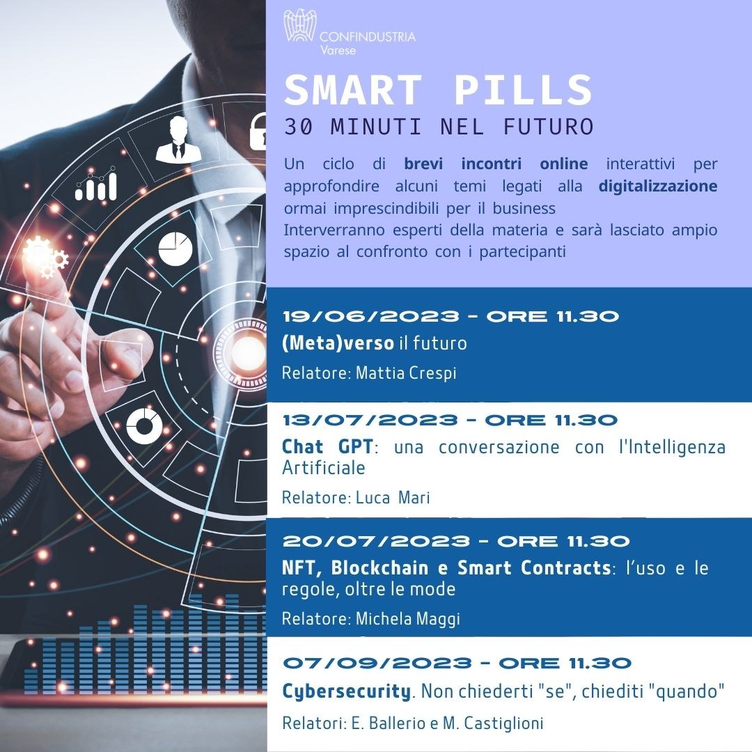 L’Area Digitale di Confindustria Varese organizza "Smart Pills - 30 minuti nel futuro", un ciclo di quattro incontri online di breve durata per approfondire alcuni temi legati alla digitalizzazione, ormai imprescindibili per tutte le imprese. Ciascun incontro vedrà protagonista una tematica di stretta attualità, affrontata da un esperto della materia.