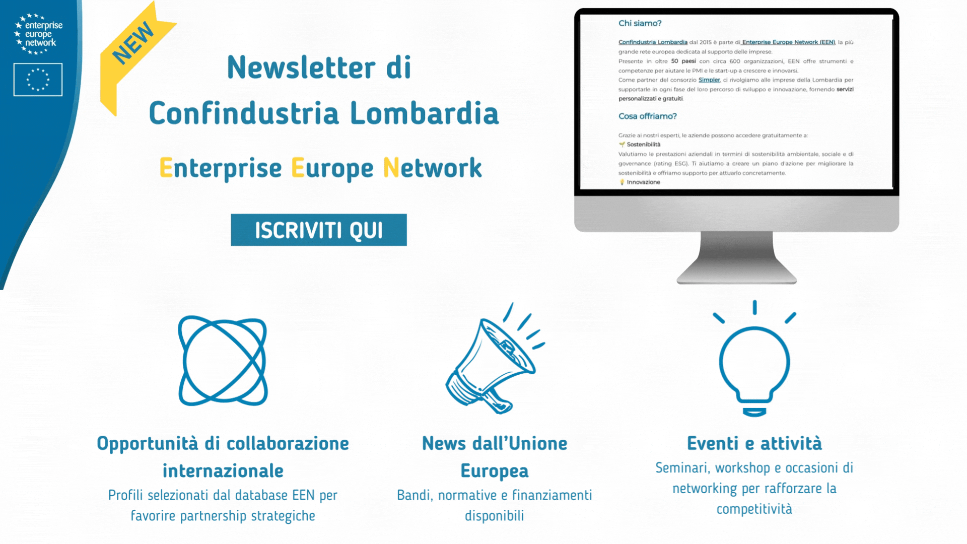 Dal 2015, Confindustria Lombardia è partner di Enterprise Europe Network (EEN), la più grande rete europea dedicata al supporto delle imprese. Con oltre 600 organizzazioni in più di 50 paesi, EEN offre strumenti concreti per favorire la crescita e l’innovazione delle PMI e delle start-up.