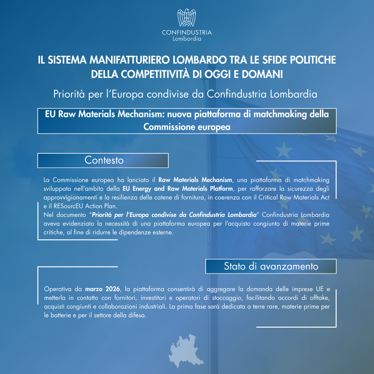 Nel documento “Priorità per l’Europa condivise da Confindustria Lombardia” (paragrafo 3.1), era stato evidenziato da Confindustria Lombardia che l’UE avrebbe creato una piattaforma per l’acquisto congiunto di materie prime critiche per ridurre le dipendenze esterne.