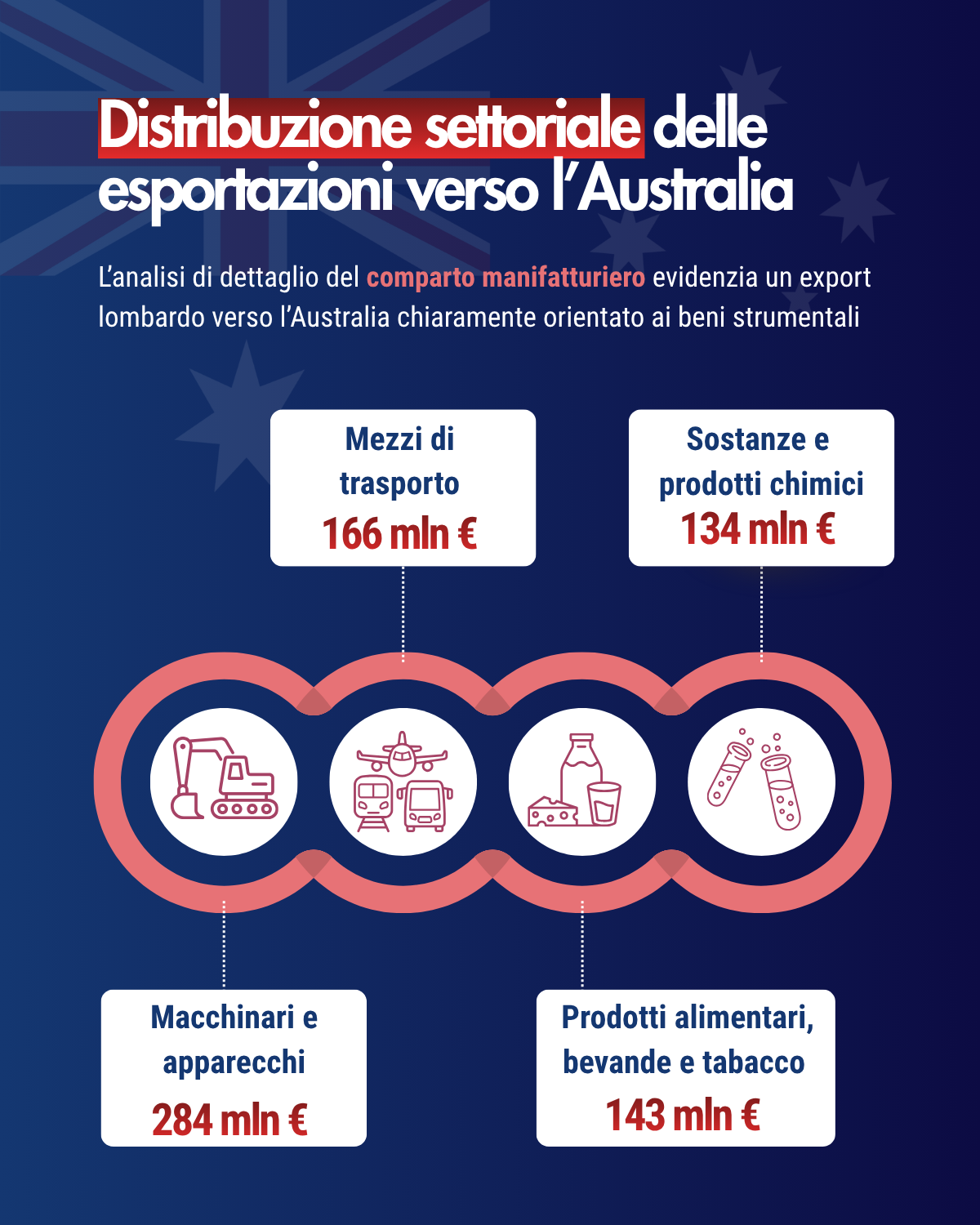 A livello territoriale Milano è il vero hub verso l’Australia: con circa 438 milioni copre il 35% dell’export regionale. Seguono le province di Varese (23%), Brescia (11%), Bergamo (9%), Monza e Brianza (6%) e Mantova (6%).