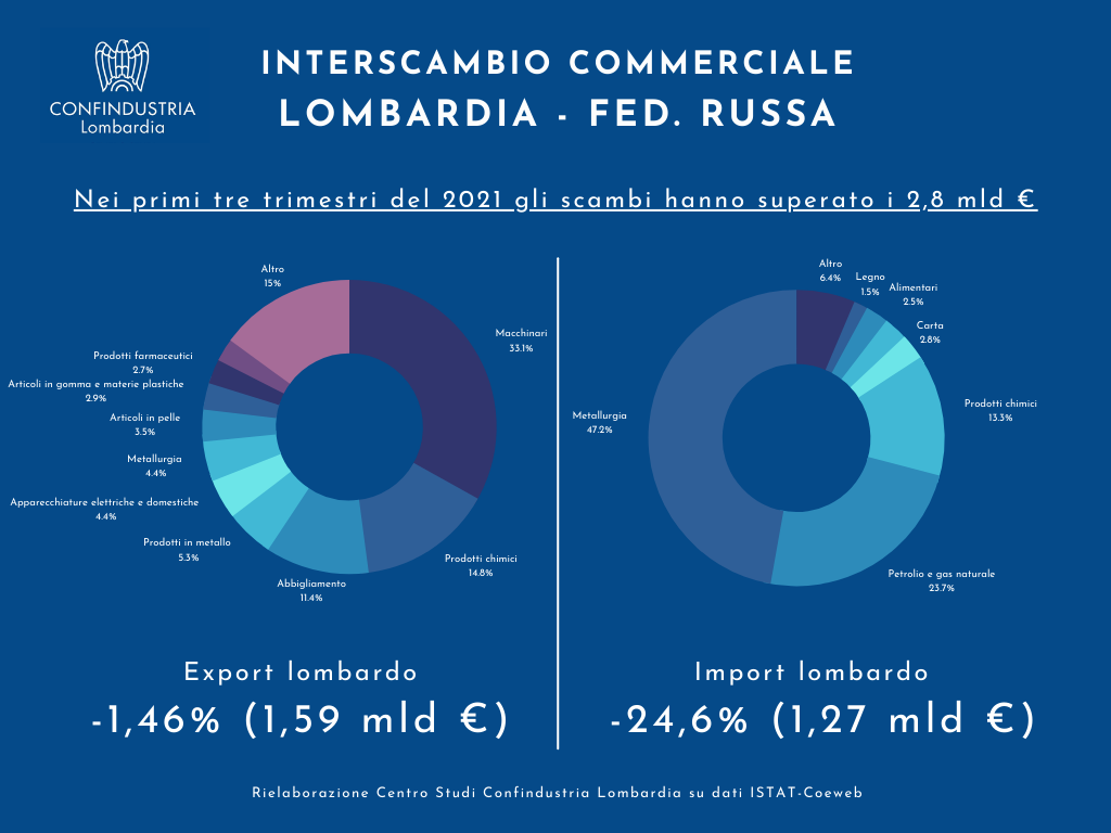 Il valore del commercio bilaterale tra Lombardia e Russia nei primi 9 mesi del 2021 è stato di 2,86 miliardi di euro con l'export lombardo che ha fatto registrare un -1,46% (1,6 miliardi €) rispetto allo stesso periodo del 2019 e l'import che è diminuito del 24,6% sempre rispetto ai primi 9 mesi del 2019.